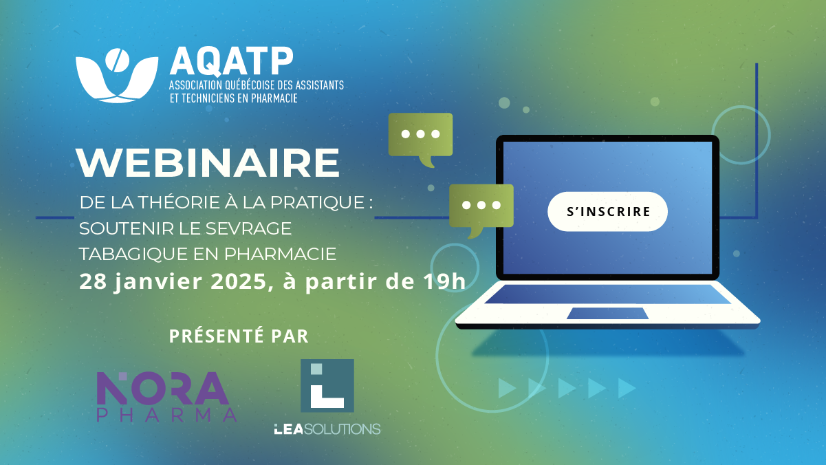Vous souhaitez être à la fine pointe des pratiques en matière de sevrage tabagique ? Ne manquez pas le webinaire de l’AQATP! Cet événement est conçu spécialement pour les assistants(-tes) et techniciens(-ciennes) en pharmacie afin de vous aider à faire évoluer vos compétences et à répondre aux besoins grandissants de la profession.