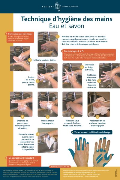La méthode de lavage a également une grande importance, autant il faut s’assurer de bien nettoyer les zones négligées (ongles, espaces interdigitaux, etc.), autant la façon d’essuyer et de sécher les mains ont un impact. Bien assécher les mains avec du papier à mains ou un linge doux en tamponnant la peau réduira le risque d’irritation. ÉVITER DE FRICTIONNER LA PEAU pour le séchage des mains.